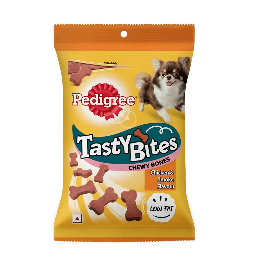 Pedigree Tasty Bites are bite-sized, delicious, and nutritious dog treats available in soft and crunchy textures—perfect for training, rewarding, and snacking.